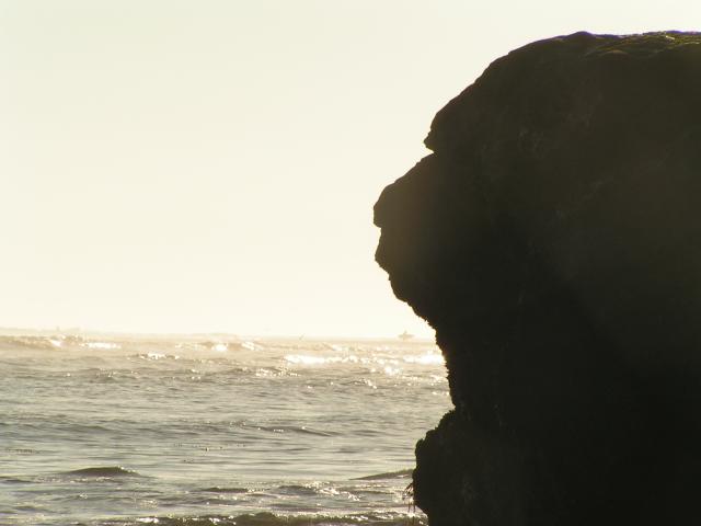 The face of a weathered rock reminds one of a tired old sea captain looking out across the sea. The formation is seen looking northwest from the beach near the end of 41st Street in Santa Cruz. A small fishing trawler forms a speck on the horizon just below his chin.