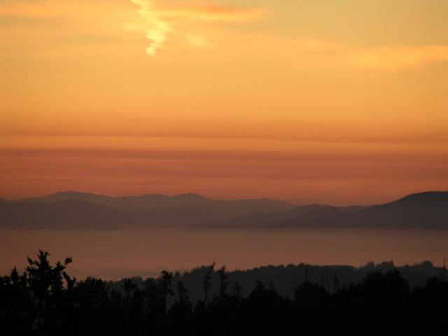 Orange light of sunrise colors thin clouds and haze over Monterey Bay.